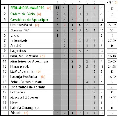 - As transferências foram muito reduzidas e as equipas são genericamente muito estanques à mudança. Acho que isso tem a ver com o facto de as pessoas não se conhecerem muito bem. Podia-se fazer um quiz especial de ano novo ou de Verão (extra-campeonato) onde se sorteassem as equipas, com as perguntas feitas por quem não organizou o quiz este ano, topas? (Hum! Isto seria alguma indirecta??! ) A desilusão são os Mineteiros. Chegam sempre tarde, andam distraídos e bem abaixo na classificação.